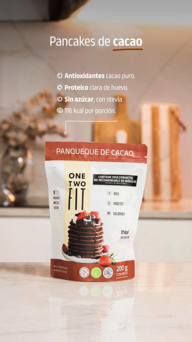 Convertí tus desayunos o meriendas en momentos funcionales y deliciosos con el Pancake con Cacao – Premezcla Proteica One Two Fit. Esta mezcla solo necesita agua para transformarse en pancakes con sabor intenso a cacao, con aporte proteico y sin azúcares añadidos (uso de stevia).