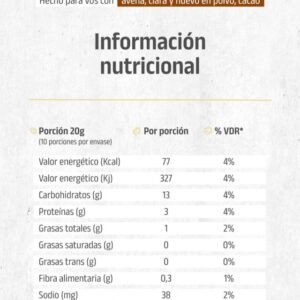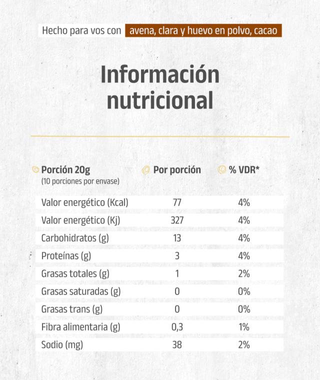 Ingredientes básicos y funcionales: avena arrollada, cacao amargo, clara en polvo, huevo en polvo, stevia y bicarbonato de sodio.